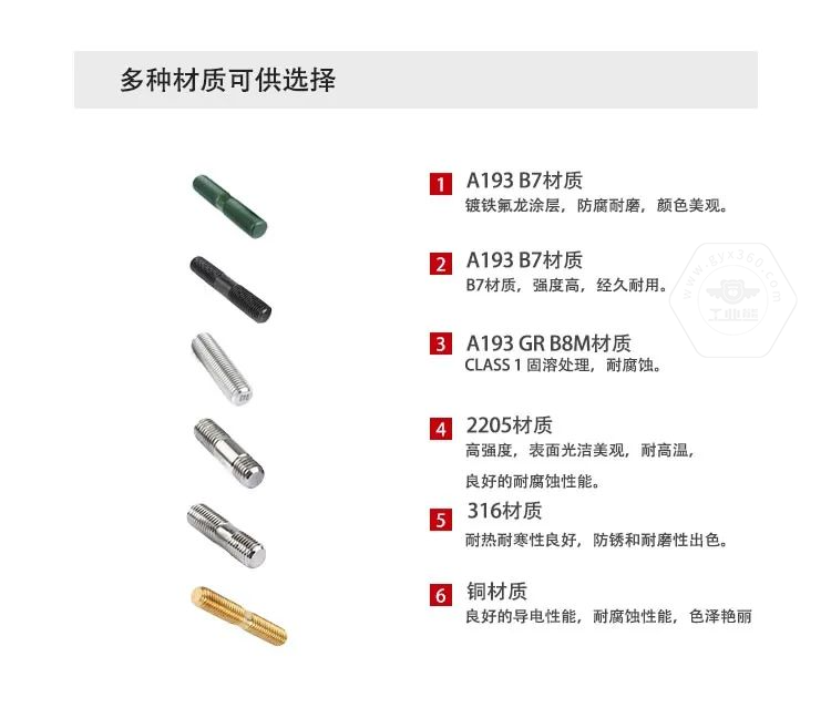 3、常用的雙頭螺柱材質(zhì):35鋼、45鋼、30CrMo、35CrMo、42CrMo、25Cr2MoV、660、304、316、304L、316L、B7、B7M、B16、B8、B8M、A320L7、2205/2507等材質(zhì)。