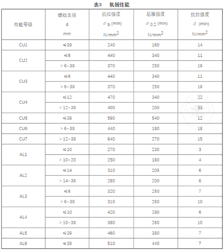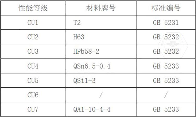 GB/T 3098.10標(biāo)準(zhǔn)中將銅制緊固件分為7個(gè)性能等級,標(biāo)記代號(hào)由字母及數(shù)字兩部分組成,即有色金屬化學(xué)元素字母加數(shù)字。其性能等級為CU1、CU2、CU3、CU4、CU5、CU6、CU7。標(biāo)準(zhǔn)中同時(shí)推薦了對應(yīng)性能等級選用的銅材料牌號(hào)。
